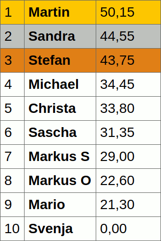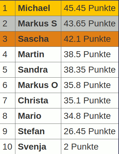 | 5 | Markus S | 36,80 | 6 | 20 | 25 | 0,722 |